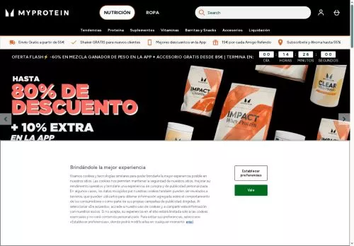 Myprotein es conocido por sus promociones muy frecuentes y agresivas. En nuestra página hay códigos promocionales disponibles casi constantemente, con descuentos que suelen oscilar entre el 30 % y el 50 %. Los periodos más interesantes son el Black Friday, las rebajas de enero y las promociones de vuelta al deporte (septiembre). Myprotein también organiza ventas flash de 24 a 48 horas con descuentos que pueden llegar al 60 %.